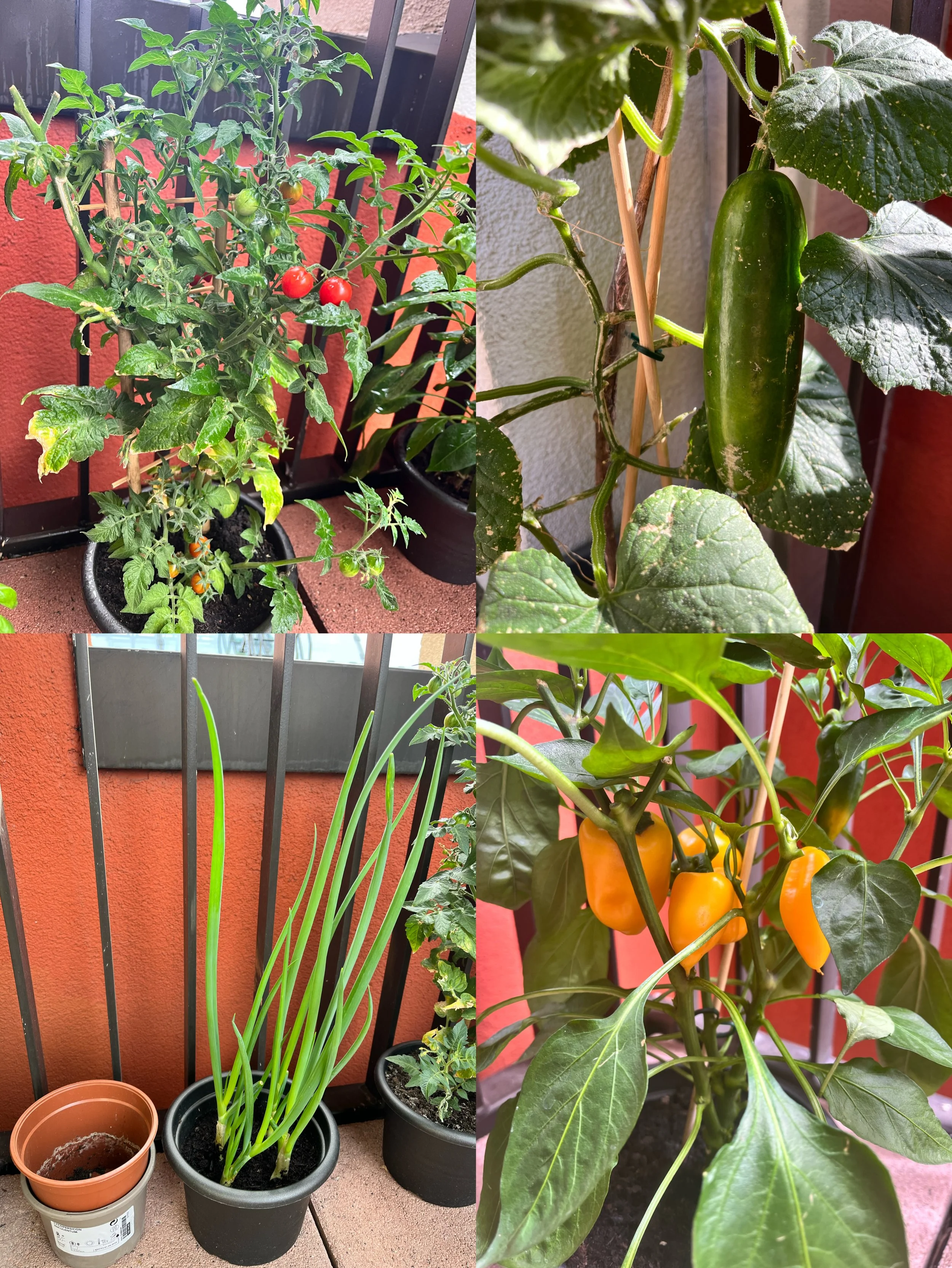 Growing vegetables on my balcony, tomatoes, cucumbers, green onions and paprikas.